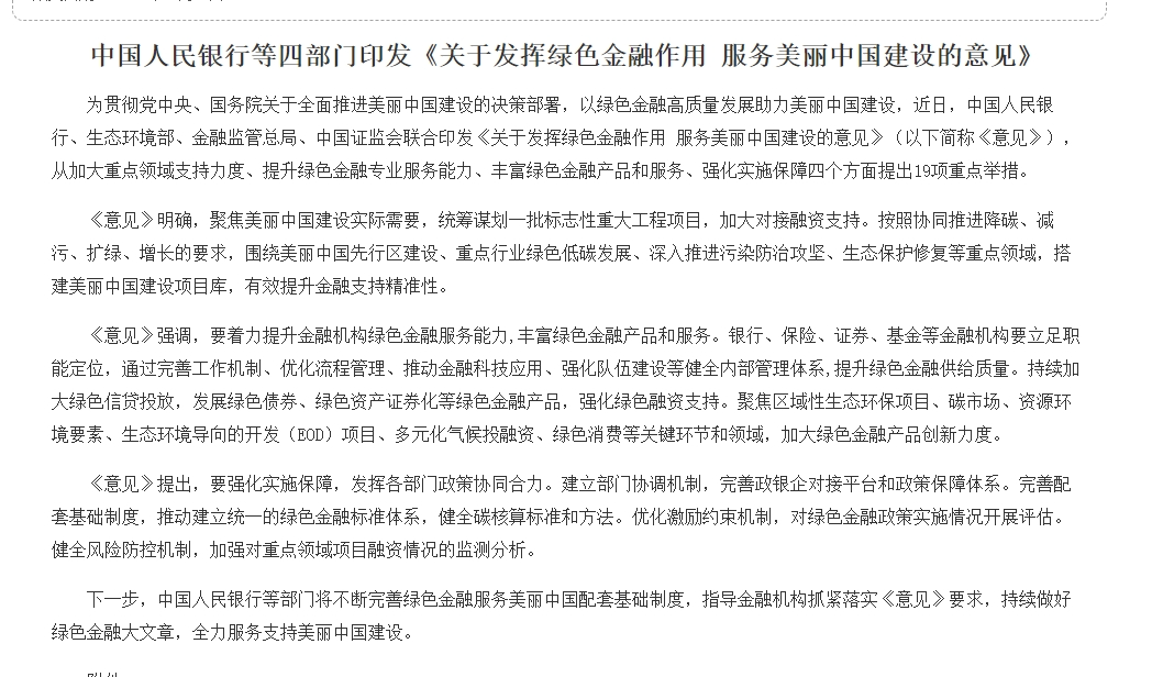 中国人民银行、生态环境部、金融监管总局、中国证监会联合发布的《意见》,标志着我国在绿色金融领域迈出了坚实的步伐。《意见》旨在通过金融手段促进环境保护和可持续发展,提出了四个方面的19项重点措施,以助力美丽中国建设。
