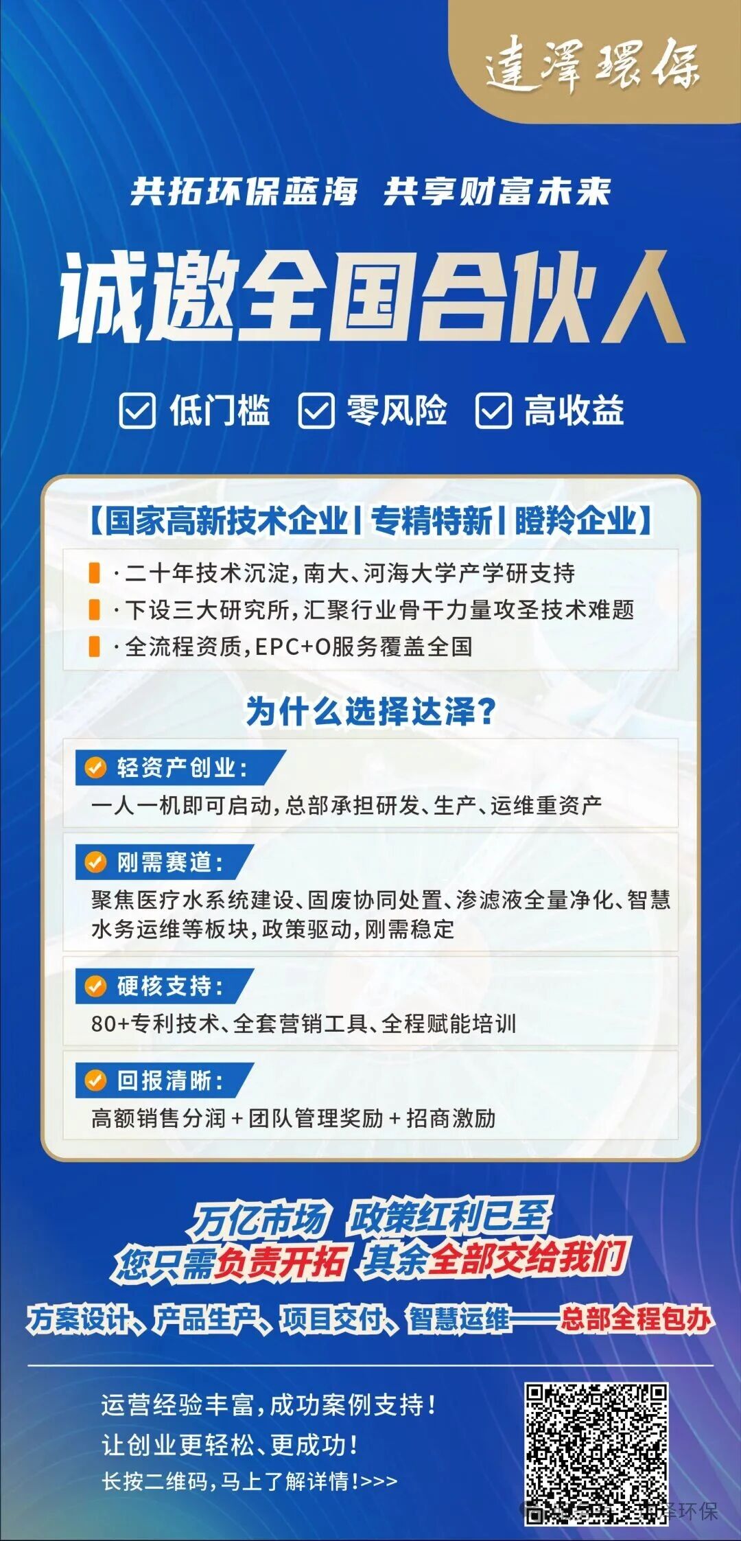 作为国家高新技术企业,水污染治理领域专精特新企业,达泽环保专注水环境污染治理多年,聚焦垃圾渗滤液全量化处理、医疗污水处理、水环境智慧运维等核心领域,拥有 9 项行业资质,具备研发、设计、生产、运营于一体,以全流程解决方案破解治理难题的综合实力。